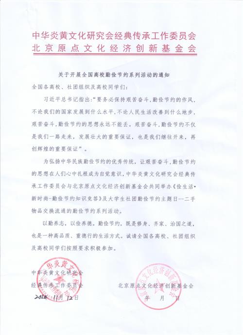 为积极贯彻落实关于厉行勤俭节约反对铺张浪费的批示精神,中华炎黄文化研究会经典传承工作委员会联合北京原点文化经济创新基金会共同主办了《2020全国高校勤俭节约知识竞答》系列活动,旨在大力弘扬节约光荣、浪费可耻的思想观念,坚决拒绝奢侈浪费、互相攀比现象,努力使勤俭节约的美德在校园中蔚然成风。