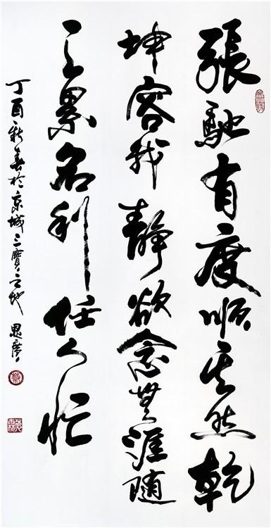 我不能也无意做什么预测将来的事,但凭我积累多半生的常识和我的直觉,我深深的知道,做为一个学者型的艺术家,书画艺术已养成生活习性已组成生命的一部分,享受书画艺术成瘾成嗜好,这样的一个艺术痴情人,德霖先生的艺术生涯一定会有更加美好幸福的广阔前程。他如同一个艺术顽童:学着、画着、写着、玩儿着、乐着,会不知不觉地自然而然地到达艺术之峰!