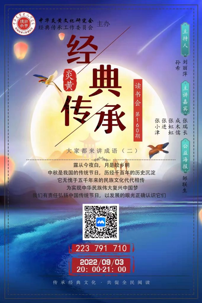 后一期各位学友在学习,理解的基础上的进一步实践,大家积极参与“大家都来讲成语”的号召,五名学友围绕中秋内容对“九天揽月”,“嫦娥奔月”,“花好月圆”,“冰壶秋月”,“千里共婵娟”几个成语故事,完成了从写讲稿并成为本期读书会的主讲人的提升,学习成果得到巩固。将炎黄经典传承读书会的目标:在循序渐进的学习中,提高大家的文化、道德素养,实现在每期读书会,每个知识点的掌握中。 最后 在微信读书会群里,大家在“知行合一”的成语接龙中圆满结束。