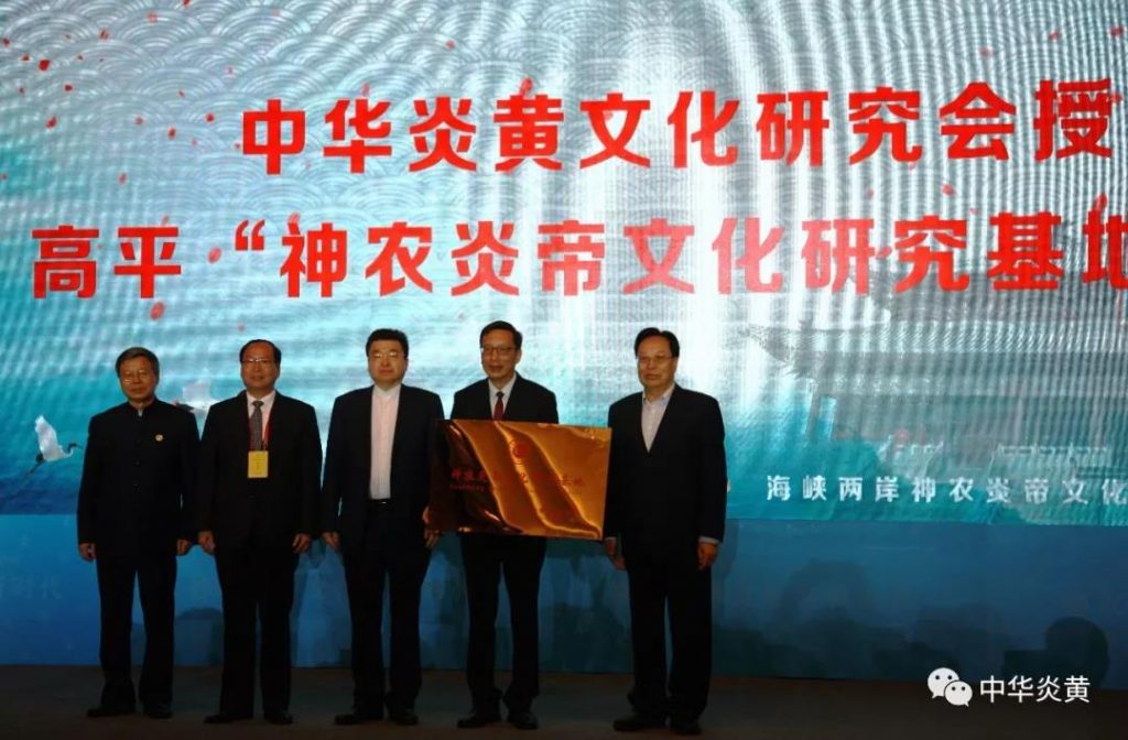 徐光春首席顾问代表中华炎黄文化研究会颁授“神农炎帝文化研究基地”牌匾,中共高平市委书记范兆森代表高平市接牌